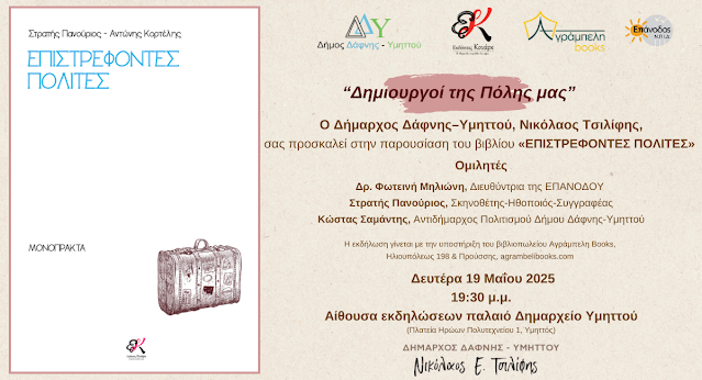 Το Τμήμα Πολιτισμού του Δήμου Δάφνης-Υμηττού τη Δευτέρα 19 Μαΐου 2025, στις 19:30 μ.μ., στην αίθουσα εκδηλώσεων του παλαιού Δημαρχείου Υμηττού παρουσιάζει το βιβλίο «ΕΠΙΣΤΡΕΦΟΝΤΕΣ ΠΟΛΙΤΕΣ» που εντάσσεται στην πολιτιστική ενότητα “Δημιουργοί της Πόλης μας” με την υποστήριξη του βιβλιοπωλείου Αγράμπελη Books.